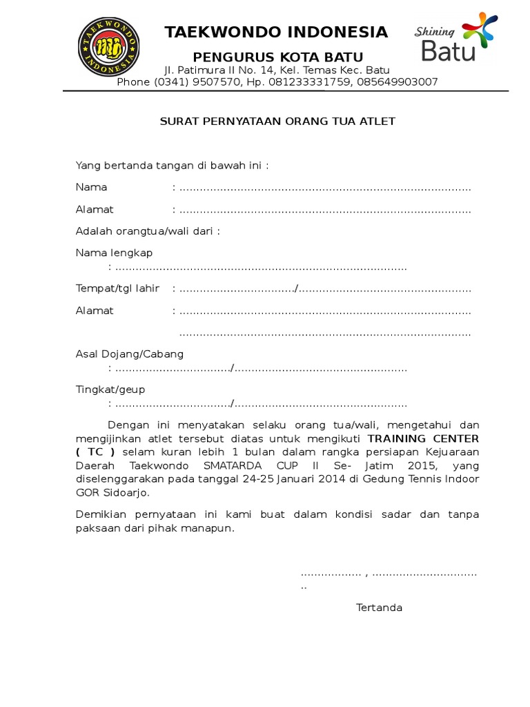 Mengikuti test pendidikan seminari menengah. Yang bertandatangan di bawah ini, saya: Ada banyak sekali jenis surat izin orang tua, baik itu untuk keperluan kerja, sekolah, kuliah, kegiatan organisasi dan masih banyak yang lainnya. 0 ratings0% found this document useful (0 votes). Jalan terusan pasir koja, gang pak sumardi no.84/194a rt 01 rw 05, kelurahan sukahaji, kecamatan babakan.