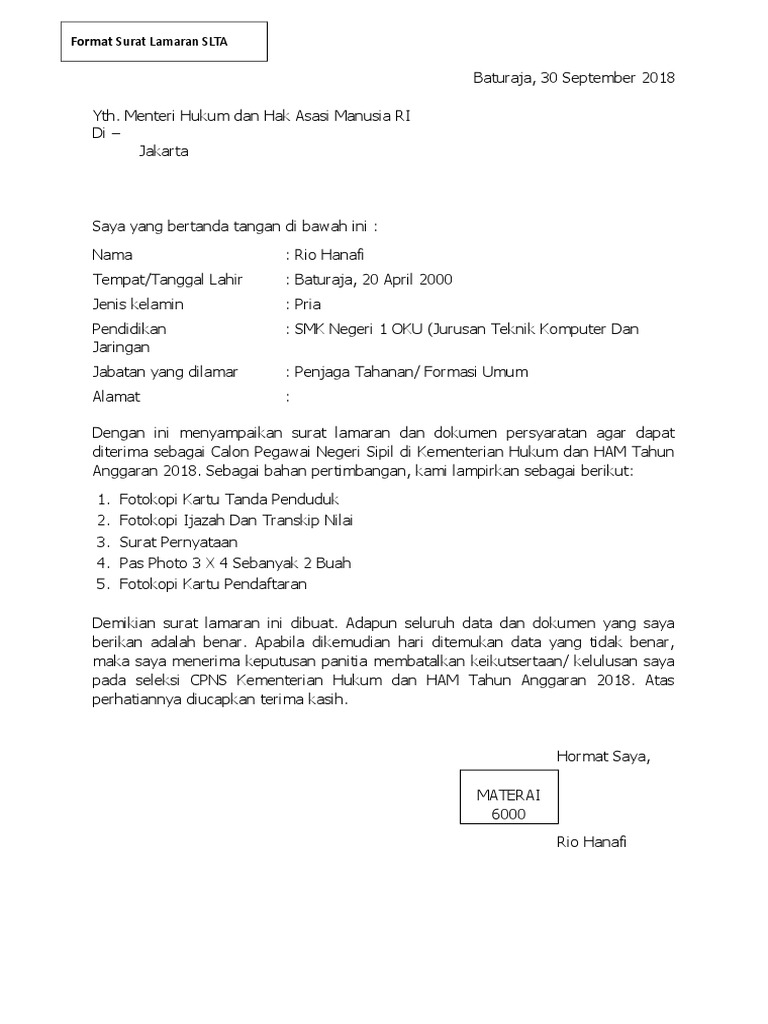 1, surat lamaran dan surat pernyataan 2. Kementerian hukum dan ham (kemenkumham), kementerian agama dan kementerian luar negeri (kemenlu). Dengan ini bermaksud mengajukan surat lamaran untuk mengikuti seleksi penerimaan cpns di kementerian hukum dan hak asasi manusia tahun anggaran 2019. Salah satu lowongan kerja yang pernah dibuka adalah lowongan kerja cpns yang diselenggerakan oleh. Semoga contoh surat lamaran kerja kementerian hukum dan ham 2012 diatas bermanfaat, dan buat yang pengen melihat info cpns kemenkumham 2012 silahkan melihat pada postingan saya mengenai cpns kemenkumham yang telah saya post beberapa waktu yang lalu. .sebuah contoh surat tentang lamaran pekerjaan. Unggah surat lamaran bermaterai rp. Oleh karena itu pada postingan kali ini akan kami bagikan format lengkapnya dalam. Itulah sebuah contoh surat lamaran kerja yang bisa anda jadikan bahan pertimbangan dalam membuatnya. Saya tujukan surat tersebut kepada menteri hukum dan ham ri di jakarta dan ditandatangani. Lowongan kerja cpns 2018, format terbaru contoh surat lamaran cpns kementerian hukum dan ham, surat lamaran penjaga tahanan, surat pernyataan tenaga sipir, surat pernyataan cpns kemenkumham. Bogor dengan ini menyampaikan surat lamaran agar dapat diterima sebagai calon pegawai negeri sipil di kementerian hukum dan ham tahun anggaran 2019. Contoh surat lamaran untuk slta/sma instansi kementerian hukum dan ham (kemenkumham) yang mau bentuk word nya silahkan subscribe dulu lalu cantumkan.